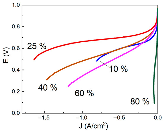 The figure shows that i–V curves for MEA with various contents of Nafion differ much from each other. Initially, an increase in current density happens as the Nafion fraction increases in the electrodes, followed by a slight decrease in the current densities (at 40% and 60% Nafion), and a significant drop (80% Nafion) is observed.