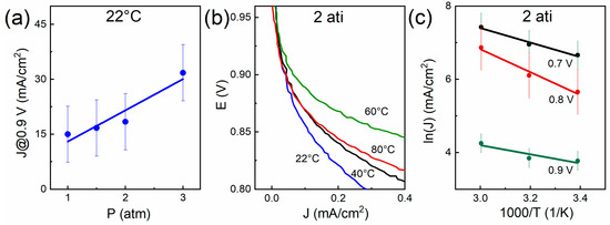 The J–P dependence (Figure 6a) can be extrapolated by the straight line. Linear approximation was derived by means of Origin Lab using the least squares method, R2 = 0.903. We explain relatively high extrapolation error by different MEA state for each measurement. As is shown in the figure (Figure 6a), the pressure significantly affects the platinum activity. Current density within the pressure range of 1–3 atm increases by ~3 times.