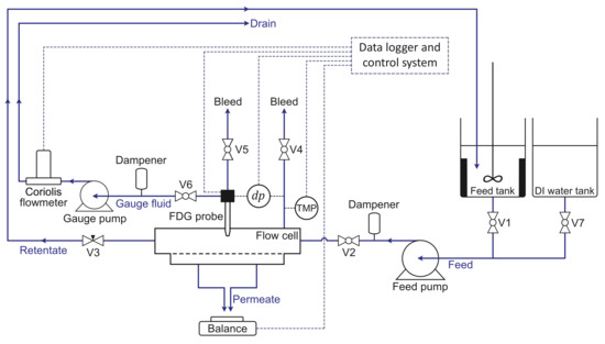 Figure 2 is a schematic diagram of the bench-scale, stainless-steel filtration test rig used in the cross-flow MF experiments. It comprised the following components: a flow cell with dimensions of 150 mm × 16 mm × 15 mm (L × W × H), an FDG probe positioned at the center of the flow channel, a precision balance for permeate collection, a baffled feed tank and a gear pump for circulating the feed suspensions, a deionized water tank, a gear pump and a Coriolis flowmeter for gauging flow control, two pressure transducers for dp and TMP measurements, two pressure fluctuation dampeners, a needle valve (V3) for TMP regulation, and six ball valves, two of which were bleed valves. Detailed technical specifications of each component can be found elsewhere [27]. Key elements of the test rig were linked to a data logger and control system and their output data monitored via LabVIEWTM 2020 (National Instruments, Austin, TX, USA).