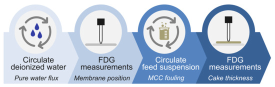 The process flow of the cross-flow MF of the MCC suspensions is illustrated in Figure 3. Three sets of MF experiments were conducted for each parameter. Each MF experiment comprised the following steps: circulation of deionized water to verify the pure water flux, FDG measurements to determine the position of the membrane, MCC fouling through the circulation of the feed suspension for a specified filtration time, and, finally, FDG measurements to estimate the thickness and strength of fouling layers.