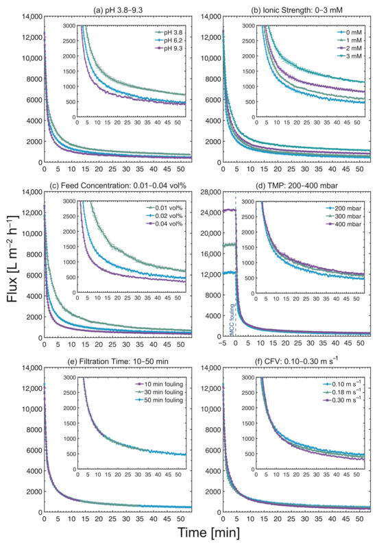 Figure 4. Permeate flux vs. filtration time during the cross-flow MF of MCC suspensions, where (a) the pH of the MCC suspension was varied from pH 3.8 to 9.3, (b) the ionic strength was tested at 0–3 mM, (c) the feed concentration range was 0.01–0.04 vol%, (d) the TMP range was at 200–400 mbar, (e) the filtration times were 10–50 min and (f) the CFVs were 0.10–0.30 m s 1 . N.B. The flux curves for pH 6.2 in (a), 0 mM in (b), 0.02 vol% in (c), 200 mbar TMP in (d), 50 min fouling in (e) and 0.10 m s 1 CFV in (f) are identical. The flux values were measured for a duration of 50 min, plus several minutes of FDG measurements.
