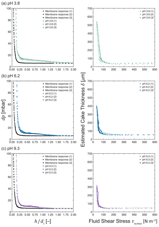 Figure 5. dp vs. h/d t and δ vs. τ w , m a x profiles as measured during the cross-flow MF of MCC suspensions at 0.02 vol%. The pH levels were (a) 3.8 (b) 6.2 and (c) 9.3, while maintaining a constant TMP, filtration time, and CFV at 200 mbar, 50 min, and 0.10 m s 1 , respectively. N.B. The x-axis of the response of a pristine membrane (•) is h 0 /d t due to the absence of a fouling layer.