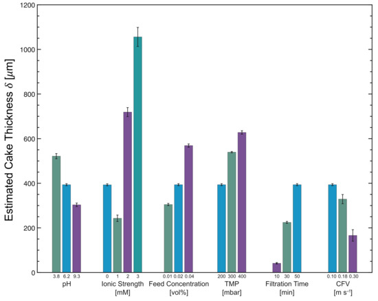 Figure 6. Summary of the fouling layer thickness during cross-flow MF of MCC suspensions under various feed and operating conditions. N.B. An identical dataset was taken for pH 6.2, 0 mM ionic strength, 0.02 vol% feed concentration, 200 mbar TMP, 50 min filtration time, and 0.10 m s 1 CFV.