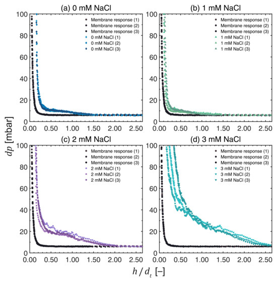Figure 7. Differential pressure, dp, over the FDG nozzle vs. the normalized probe distance, h/d t , as measured during the cross-flow MF of MCC suspensions at 0.02 vol%. The ionic concentration was tested at (a) 0 mM NaCl, (b) 1 mM NaCl, (c) 2 mM NaCl, and (d) 3 mM NaCl, while maintaining a constant TMP, filtration time, and CFV at 200 mbar, 50 min and 0.10 m s 1 , respectively. N.B. The x-axis of the response of a pristine membrane (•) is h 0 /d t due to the absence of a fouling layer.