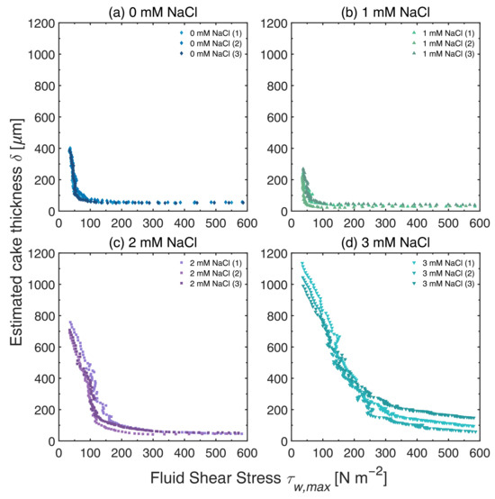 The thickness vs. shear stress profiles at various ionic concentrations in Figure 8 confirm this trend: the thickest layers were estimated at 3 mM NaCl, while the thinnest layers were measured at 1 mM NaCl. The thickness of the fouling layers in Figure 6 and Figure 8 are 394 ± 5 μ m at 34.8 ± 0.6 Pa, 244 ± 14 μ m at 36.7 ± 0.7 Pa, 719 ± 20 μ m at 35.0 ± 0.7 Pa, and 1057 ± 43 μ m at 36.2 ± 0.9 Pa for 0 mM, 1 mM, 2 mM, and 3 mM NaCl, respectively. At higher ionic concentrations, the surface charges are shielded more effectively and larger agglomerates are formed, and their deposition onto the PES membrane surface resulted in thicker cake layers. However, this trend was not observed when 1 mM NaCl was added. As mentioned above, the reason for this behavior is not fully understood, but it may be attributed to the weaker stability of the agglomerates formed at 1 mM NaCl, which promotes their redispersion during cross-flow MF and results in thinner fouling layers being formed. Another possible explanation is related to the change in the surface charge of the membrane, which could also contribute to shielding effects.