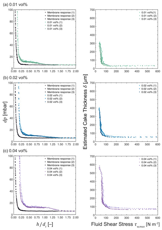 Figure 9. dp vs. h/d t and δ vs. τ w , m a x profiles as measured during the cross-flow MF of MCC suspensions at an unadjusted pH of 6.2. The feed concentration was varied at (a) 0.01 vol%, (b) 0.02 vol% and (c) 0.04 vol%, while maintaining a constant TMP, filtration time, and CFV at 200 mbar, 50 min and 0.10 m s 1 , respectively. N.B. The x-axis of the response of a pristine membrane (•) is h 0 /d t due to the absence of a fouling layer.