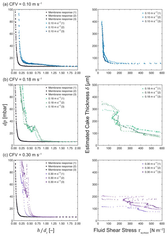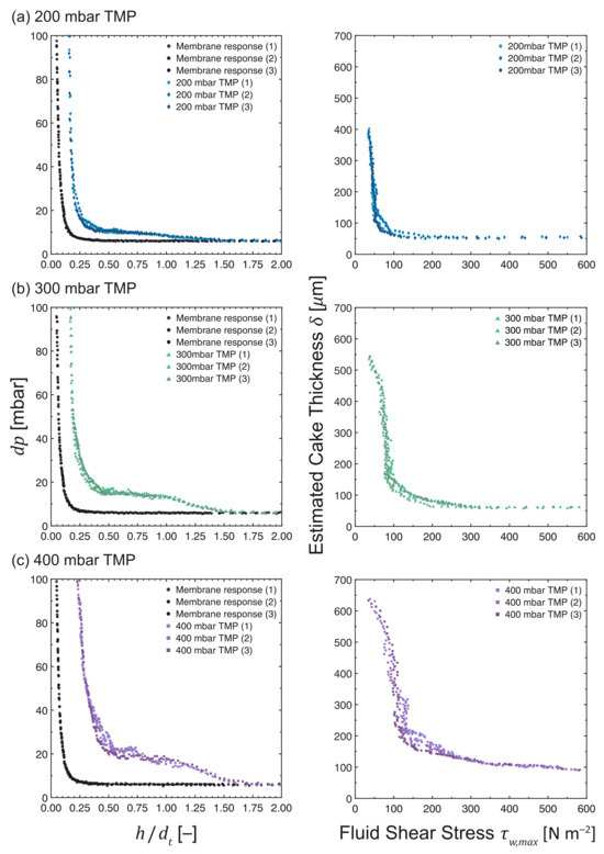 Figure 10. dp vs. h/d t and δ vs. τ w , m a x profiles as measured during the cross-flow MF of MCC suspensions at 0.02 vol%. The operating TMP was varied at (a) 200 mbar, (b) 300 mbar and (c) 400 mbar, while maintaining a constant filtration time and CFV at 50 min and 0.10 m s 1 , respectively. N.B. The x-axis of the response of a pristine membrane (•) is h 0 /d t due to the absence of a fouling layer.