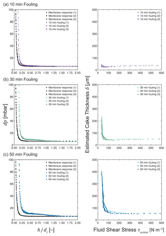 Figure 11. dp vs. h/d t and δ vs. τ w , m a x profiles as measured during the cross-flow MF of MCC suspensions at 0.02 vol%. The filtration time was varied at (a) 10 min, (b) 30 min and (c) 50 min, while maintaining a constant TMP and CFV at 200 mbar and 0.10 m s 1 , respectively. N.B. The x-axis of the response of a pristine membrane (•) is h 0 /d t due to the absence of a fouling layer.