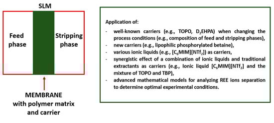 Since the membrane processes conducted using various SLMs are affected by many factors (e.g., membrane composition, form and properties, feed phase properties—e.g., whether the separation concerns a single REE or a mixture of REEs from model single or binary solutions, or from real multi-component solutions, stripping phase composition and pH, etc.) studies that support experimental work with the development of advanced mathematical models for analyzing metal ion separation have also been recently performed [,]. The application of mathematical models may be particularly useful when “designing” membranes that could potentially be implemented in the future on an industrial scale. In the case of SLM-based methods, in addition to the efficiency of the process, the stability of the developed membrane also plays an important role because the need to frequently replace membranes will increase the costs of REE ion recovery and may also constitute a technical problem. The stability of SLMs during long operation may be affected by various parameters, e.g., the nature of support and organic phase of the membrane, and conditions in which the membrane operates. Therefore, choosing the right separation method and optimal experimental conditions can be a challenge and, as noted by Kostanyan et al. [], “to select an appropriate method for solving the set separation problem, as well as for its optimal design, preliminary mathematical modeling is necessary”. Recently, Tyagi et al. [] used an artificial neural network coupled with a genetic algorithm for modeling and optimization of the separation of neodymium ions with the use of a supported liquid membrane (with TOPO carrier) and, after the analysis of the effects of different input factors on the transport rate, determined the optimum set of parameters that provided the maximum extraction. Figure 1 shows the main modifications related to the formation of SLMs intended for REEs recovery (since 2019).