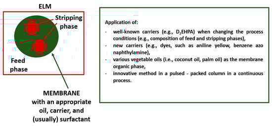 In addition to modifying ELM separation processes by changing the composition of membranes (replacing some components with others, e.g., exchanging organic solvents and commonly utilized carriers with vegetable oils and ILs, respectively) and conditions of experiments, research is also carried out to intensify the processes in which membranes containing well-known carriers and solvents are used. For example, Sadehlari et al. [] developed a novel method for an emulsion liquid membrane in a pulsed-packed column in a continuous process, which was used for dysprosium (III) extraction. The ELM applied in the experiments consisted of common components such as D2EHPA as the carrier, Span 80 as the surfactant, kerosene as the diluent, and nitric acid as the internal phase. In the studies, flooding conditions and holdup at flooding points of the packed column were characterized, as well as operational parameters affecting the flooding points, such as pulsation intensity and the flow rate of the continuous and dispersed phases. The obtained results showed that under optimal process conditions, as much as 99.7% of dysprosium was extracted, and what is more, the extraction efficiency of the recovered membrane was as high as the unused membrane phase. The results are promising and indicate new possibilities for using ELMs on a larger scale in the future. Moreover, once the parameters influencing the novel membrane process have been determined, the new method may also potentially be used for efficient and continuous extraction of other REEs. Figure 2 shows the main modifications related to the formation and use of ELMs intended for REEs recovery (since 2019).
