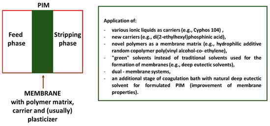Summarizing, separation processes based on the application of PIMs are becoming more and more popular, and the possibility of relatively easy modifications to membranes (e.g., the use of various compatible carriers and polymers, the use of ILs for improving membrane stability, etc.) and experimental conditions (e.g., stripping phase composition and pH) allows their effective use for the removal/recovery of various substances from aqueous solutions (e.g., lithium and magnesium ions, heavy metal ions, REEs, etc.) [,,]. However, it should be emphasized that various membrane techniques are being systematically developed, and new solutions are being introduced. For example, for water purification, the possibility of using more advanced materials (e.g., inorganic–organic hybrid membranes, and MXene-based hybrid nanomaterials) has been recently investigated [,].