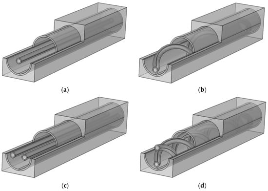 The simulated 3D HF-WGMD units with (a) single straight fiber, (b) single helical fiber, (c) double straight fibers, and (d) double helical fibers, all inserted inside the unit cooling tube.
