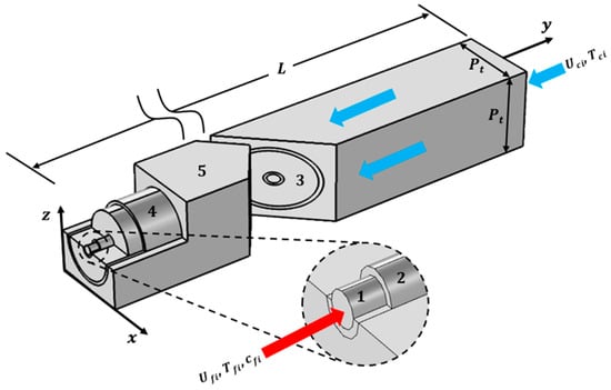 A representation diagram of the 3D simulated HF-WGMD unit. (1) Feed channel, (2) HF membrane, (3) water gap, (4) cooling tube, and (5) coolant channel.