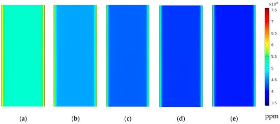 Feed water salinity contours at middle of half section in the feed channel of desalination unit with single straight fiber at ; (a) , (b) , (c) , (d) , and (e) .
