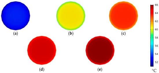 Feed water temperature contours at cross section at middle of fiber length of desalination unit with single straight fiber at ; (a) , (b) , (c) , (d) , and (e) .