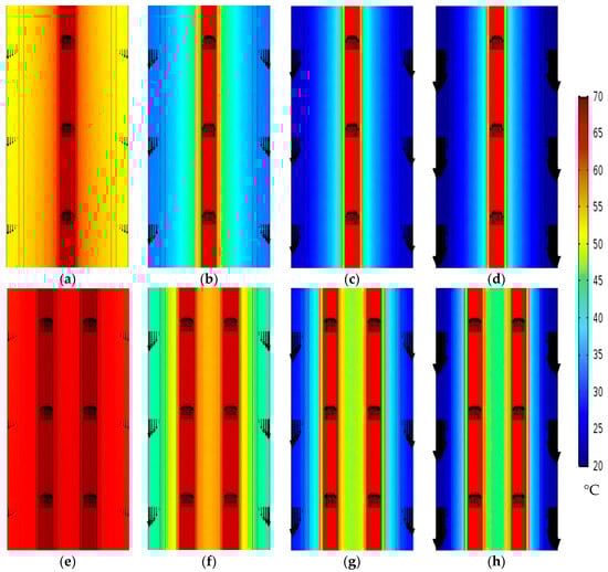 Temperature contours at middle of section in desalination unit at with single fiber [(a) , (b) , (c) and (d) ], and double straight fibers [(e) , (f) , (g) and (h) ]. The arrows represent the axial velocity magnitudes relative to each other.