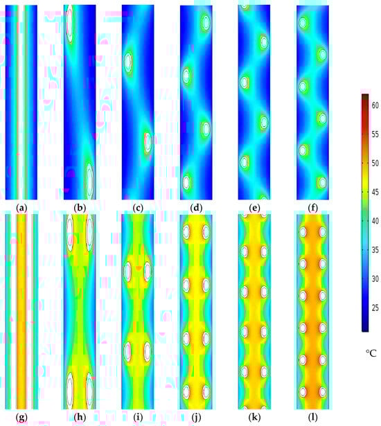 Water gap temperature contours at middle of section at for desalination unit with single (a) straight fiber with (b) , (c) , (d) , (e) , and (f) turns of helical fibers and double (g) straight fibers with (h) , (i) , (j) , (k) , and (l) turns of helical fibers.