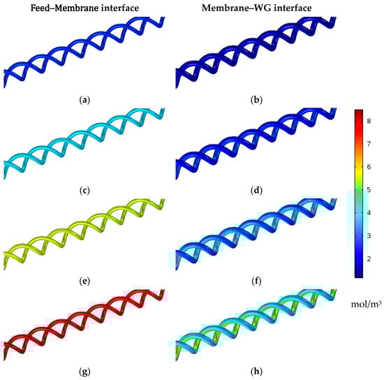 Water vapor concentration contours on both HF membrane interfaces with turns of double helical fibers at . (a,b) , (c,d) , (e,f) , and (g,h) .