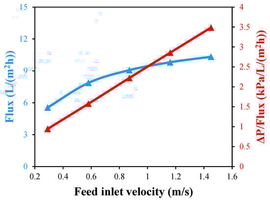 Water output flux and pressure drop per unit flux against feed inlet velocity with single straight fiber module at and .