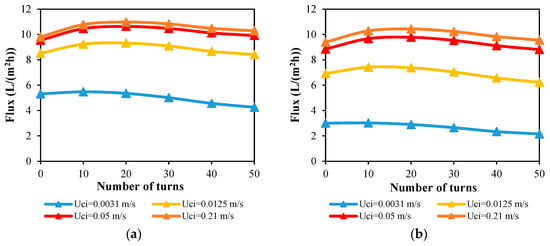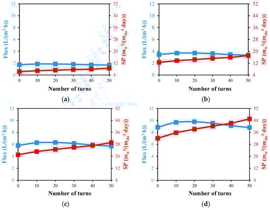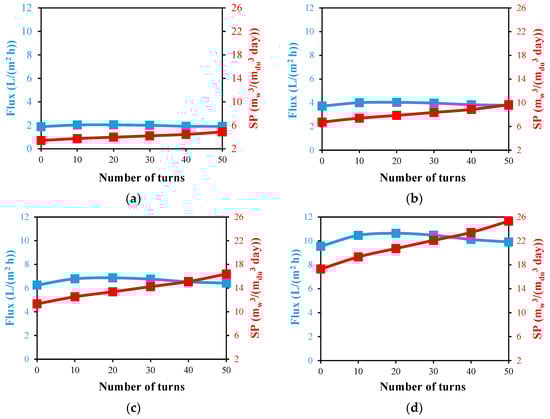 Water output flux and specific productivity against number of HF helical turns for desalination unit with double fibers at ; (a) , (b) , (c) , and (d) .