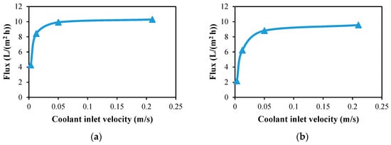 Water output flux against coolant inlet velocity at for a desalination unit with turns of helical fiber; (a) single and (b) double.