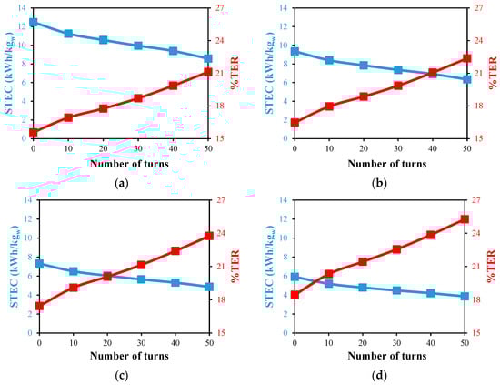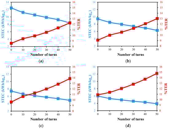 STEC and %TER against number of HF helical turns for desalination unit with single fiber at ; (a) , (b) , (c) , and (d) .