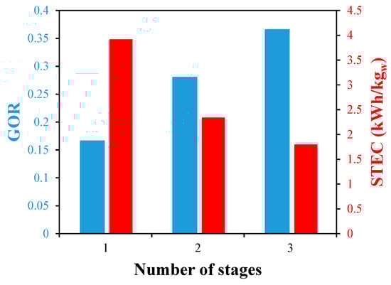 The effect of multi-stages in series on the GOR and STEC of of single helical fiber desalination units at , and .