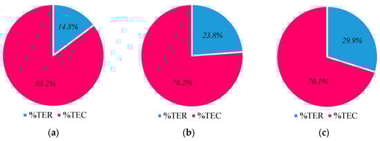Percentage of thermal energy recovered of (a) one, (b) two, and (c) three single helical fiber desalination units with 50 turns fitted in series at , and .