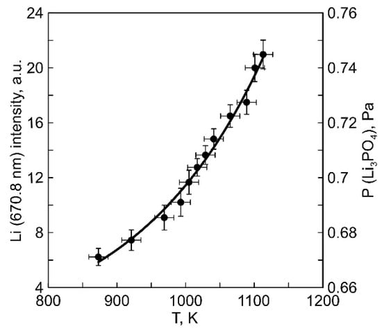 The Ar line (811.5 nm) was used in the measurements corresponding to a state with an excitation cross-section similar to Li [26,27]. The value of K was determined using known data from the database [28]. The proportion of free Li in the vapor was estimated as the ratio of nLi and the concentration of Li3PO4 vapor determined from experimental data (Appendix A).