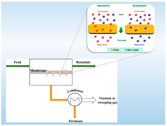 Ethanol, also known as ethyl alcohol, has gained significant attention due to its diverse applications in various industries, including fuel production, food and beverages, pharmaceuticals, healthcare industry, and chemical manufacturing. However, ethanol obtained through the fermentation process typically exhibits a low concentration ranging from 5% to 12% by weight []. Consequently, the purification of ethanol from mixtures necessitates a dehydration step [,]. Traditional dehydration methods, such as distillation, may face limitations due to the occurrence of an azeotropic point between organic compounds and water. In addition to this, when the organic (ethanol) compound is aimed at being separated directly from the fermentation broth, its separation/extraction is challenging due to the complexity of the media. To overcome these limitations, the pervaporation (PV) process, as illustrated in Figure 1, has emerged as a promising alternative, offering several notable advantages, such as cost-effectiveness, low operating temperatures, a straightforward operational process, and a high production efficiency [,,]. It is important to emphasize that the membrane plays a pivotal role in the PV separation process []. Thus, careful consideration of the materials used in membrane preparation, as well as the membrane’s structure, is crucial to enhance the PV separation performance.