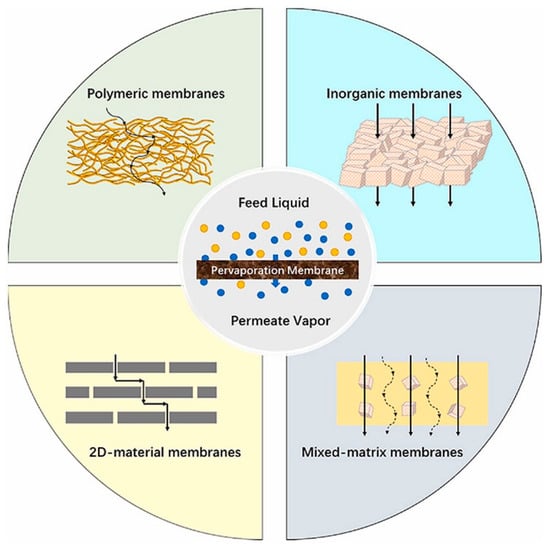 In recent years, a number of comprehensive reviews have addressed various aspects of pervaporation separation, often focusing on specific types of membrane materials [,,] or particular applications [,,,]. However, to the best of our knowledge, there has not been a detailed overview of the ongoing and most recent developments in pervaporation (PV) membranes, particularly with a primary emphasis on ethanol dehydration. As ethanol is the leading organic solvent used in many manufacturing industries, PV requires superior materials with high selectivity when adapted into membranes. Therefore, the present review paper offers a comprehensive overview of the ongoing research and recent advancements in the field of PV applied to ethanol dehydration (water–ethanol mixtures) and the simultaneous production and extraction of ethanol (ethanol–water mixtures). Furthermore, it conducts an in-depth analysis of polymer membranes, inorganic membranes, thin-film composites, and mixed matrix materials utilized in this context. Notably, considerable emphasis is placed on the recovery of ethanol from ethanol–water mixtures, accompanied by extensive investigations into the separation performance of developed membranes.