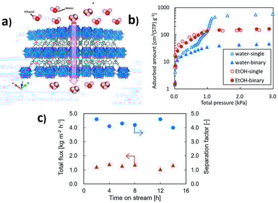 Schematic illustrations of the application of pure MOF-based membranes in pervaporation for the recovery of ethanol from aqueous solutions, (a) hypothetical mechanism of transport, (b) water and ethanol adsorption capacity, and (c) pervaporation separation performance (ethanol–water (10:90 wt.%) at 323 K). Adapted from [].