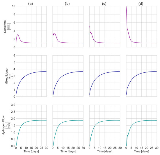 Figure 2 shows the results of different paths to the steady state from different initial conditions. The simulation indicates that the steady state for the substrate, biomass concentration, and hydrogen flow remains constant for all the tested conditions. At low COD initial concentrations, the curves remain smooth. However, once the reactor is fed (transient state), noise begins to appear in the curves as the concentration increases (Figure 2c,d). The explanation for this phenomenon lies in the expressions of generation and consumption of each of the metabolites. The algebraic expressions for generation and/or consumption directly depend on the metabolites’ concentration. As a result, irregularities in the curves could be due to high derivative values. This behavior is typical for ADM1 and ADM1-based models, as an overprediction of the metabolites’ concentrations is often reported under start-up conditions [17]. For design and scale-up purposes, it is essential to consider steady-state conditions.