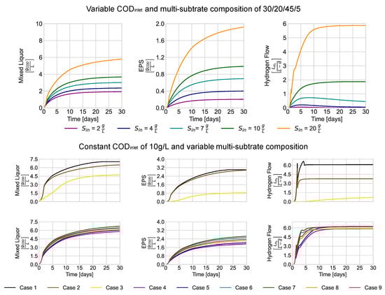 Figure 3 illustrates the simulation results for the evolution of biomass, EPS, and hydrogen, considering different values of inlet COD with a multi-substrate composition of 30% amino acids, 20% sugars, 45% fatty acids, and 5% inert matter [17]. The chosen COD values are representative of high-strength wastewater, as described by Shin et al. (2021) [16]. The simulation exhibited the expected behavior for each set of CODinlet concentrations, showing increasing biomass, EPS, and hydrogen production with higher CODinlet. However, the biogas composition depended on the substrate composition. Specifically, when considering a 10 g/L CODinlet with variable content of amino acids/sugars/fatty acids/inert matter, the largest hydrogen production was observed with a 100% amino acids substrate (Case 1). However, this substrate composition also generated the highest EPS concentrations in the mixed liquor, potentially impacting membrane durability and performance [34,35]
