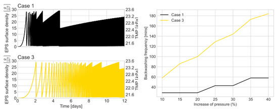 Left: Effect of inlet composition in EPS surface density and TMP. Time series follows the same trend for both EPS and TMP. Right: Effect of increasing transmembrane pressure tolerance in backwashing frequency. Case 1—100/0/0/0, Case 3—0/0/100/0.