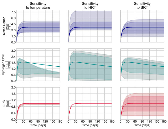Changes in concentration of MLSS, biohydrogen production rate, and EPS concentration in relation to temperature, HRT, SRT. This simulation was obtained for HRT of 12 h, SRT of 6 d, inlet COD of 10 g/L, and a temperature of 35 °C. The figure shows an OAT analysis for variations of 50% (darkest) and 70% (lighter) for the mentioned design variables.