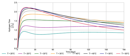 Figure 5 presents the results of the OAT analysis for three variables that notably impact hydrogen production and membrane fouling. Temperature changes (±50% change) directly affect the kinetic expressions governing mixed liquor solids (i.e., biomass) and hydrogen flow. The OAT analysis reveals that the temperature should be maintained under mesophilic conditions to increase hydrogen production, as there is no significant advantage observed with thermophilic operation. Higher temperatures increase hydrogen solubility, promoting inhibition (Equations (18)–(21)). Even though the model suggests less hydrogen production at room temperature, the hydrogen saturation is slower but remains constant (Figure 6). These results are consistent with existing laboratory studies that report higher bioH2 production at ambient or mesophilic temperatures than those reported for thermophilic reactors [39]. In addition, the microbial ecology is more diverse in reactors under mesophilic conditions [40]. Finally, increasing the reactor temperature is directly associated with higher energy consumption and costs.
