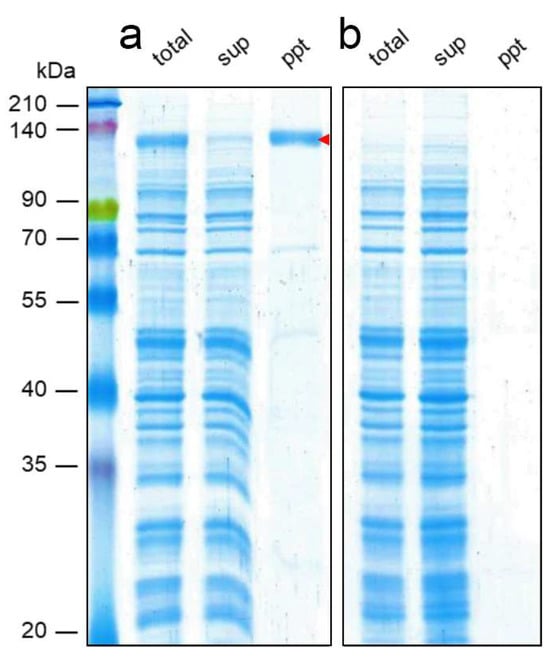 (a) hERG channel synthesized using a wheat germ cell-free translation system in the presence of PC+PE+Chol-vesicle, separated by SDS-PAGE and stained with CBB. The red arrowhead indicates the band of the hERG channel. (b) PC+PE+Chol-vesicle treated with the wheat germ cell-free translation system without mRNA. sup: supernatant, ppt: precipitate.
