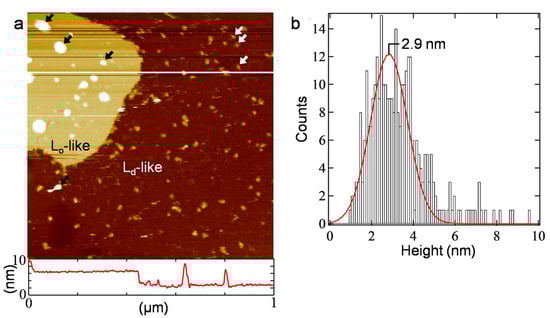 (a) An AFM topography (1.0 × 1.0 μm2) of the SLB prepared from PL using the same protocol as that of Figure 2 but without staining, along with a cross-section profile at the white line. Representative protrusions existing mainly in the Ld-like and Lo-like regions are indicated with the white and black arrows, respectively. (b) Histogram of the height of the protrusions existing in the Ld-like region. The red curve represents the result of the Gaussian fitting.