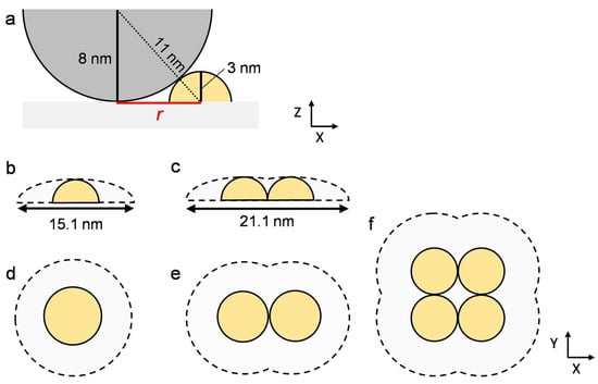 Schematics illustrating the effect of tip size on apparent lateral size in AFM topographies. (a) The cantilever tip (curvature radius = 8 nm) in contact with a 3 nm high hERG channel monomer assumed to be a hemisphere at a distance r. (b,c) Traces of the tip scanning (b) a monomer and (c) a dimmer or a tetramer. (d–f) Apparent areas of (d) a monomer, (e) a dimer, and (f) a tetramer including the effect of the tip size.