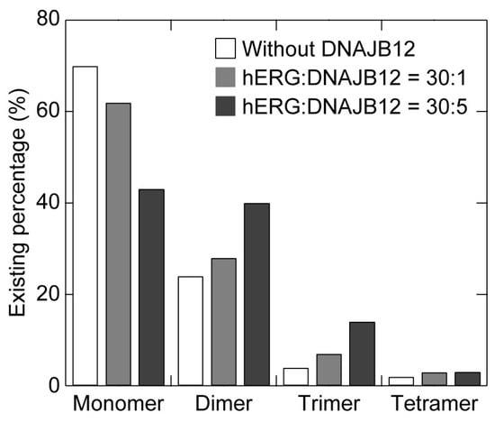 Existing percentage of the hERG channel monomers in the forms of monomers, dimers, trimers, and tetramers in the absence and presence of coexpressed DNAJB12.