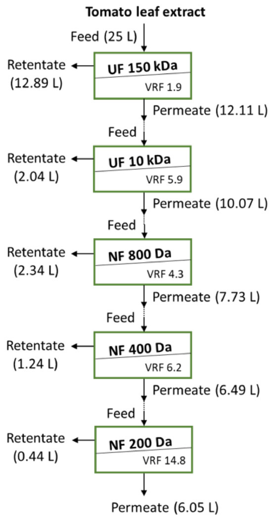 Schematic of the cascade membrane stages used to study the tomato leaf extract clarification and fractionation.