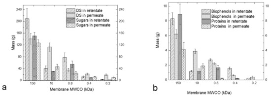 Figure 4a shows the mass of DS and sugars in the retentates and permeates from different membranes, and Figure 4b shows the mass of biophenols and proteins in the same streams (it is worth noting that the high mass in the retentate of UF 150 kDa is due to the low VRF of this stage). The results confirm that sugars and proteins are mainly present in the fraction 10–0.8 kDa (retentate of 800 Da); biophenols with sizes between 400 and 800 Da are present in the retentate of 400 Da.