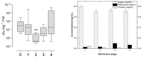 (a) Measurement of Pseudomonas syringae population growth (cfu: colony-forming unit) on tomato plant leaves after the “plant vaccination”, according to the protocol described in Section 2.2.4, with the use of the membrane produced fractions. Where C: control, 1: 10 kDa retentate, 2: 800 Da retentate, 3: 400 Da retentate and 4: 200 Da retentate. ** Denotes significantly different from control, p < 0.01 by Kruskall-Wallis test followed by Dunn’s multiple comparison post-hoc test. (b) The concentrations of sugars, biophenols, and proteins for each of the Figure 5a retentate fractions. These concentrations were calculated under the same final dilution of DS (1 mg/mL), based on each fraction’s initial concentration for each group of compounds.