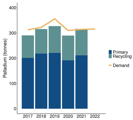 Global supply and demand of palladium from 2017 to 2022. Data are taken from [3]. For 2022, data were available for demand only.