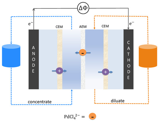 In the desalination experiments, two 150 mL batches of the industrial solution were recirculated at a flow rate of 100 mL/min. Spacers were introduced between the membranes to aid solution flow and mixing. End spacers were positioned between the electrodes and adjacent CEMs. Each batch was stirred with a magnetic stirrer. A 500 mL batch of 0.5 M sodium sulfate rinse solution was recirculated through the electrode compartments. Experiments were run at a constant current of either 0.5 A or 1 A for two hours. During the experiments, 25 mL samples were collected every 30 min and their palladium concentration was analyzed.