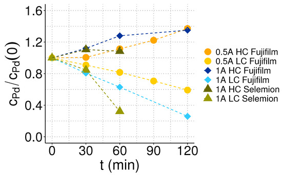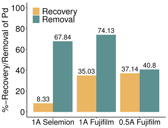 For both sets of membranes, a significant disparity between palladium removal and recovery was observed when working with a current of 1 A, as highlighted in Figure 4. With Selemion membranes, the removal was 60% higher than the recovery, and with Fujifilm membranes, the removal exceeded the recovery by 40%. Subsequently, an additional electrodialysis experiment was carried out using Fujifilm membranes while applying a current of 0.5 A, corresponding to a current density of approximately 14 mA/. Interestingly, a similar level of palladium recovery was attained with Fujifilm membranes at both 1 A and 0.5 A currents, while at the lower current, the mismatch between removal and recovery was less than 4%.
