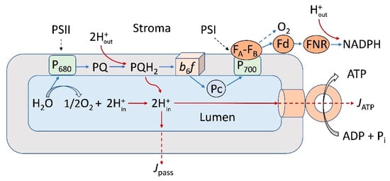 In energy-transducing membranes of photosynthetic organisms, mitochondria, and bacterial cells, generation of the pmf is associated with the functioning of electron transport chains (ETC). In photosynthetic systems of an oxygenic type (chloroplasts of high plants, algae, and cyanobacteria), the ETC includes two membrane-bound protein complexes, Photosystems I and II (PSI and PSII), which are interconnected via the cytochrome (Cyt) complex b6f and mobile electron carriers (plastoquinone and plastocyanin) []. Operating in tandem, PSI and PSII facilitate the transfer of electrons from the water molecule, oxidized by the water-splitting complex of PSII, to NADP+, the terminal electron acceptor of PSI (Figure 1). The light-induced electron transfer induces the translocation of protons into the intra-thylakoid volume (lumen) of chloroplasts, accompanied by the acidification of the lumen (pHin↓) and alkalization of the chloroplast stroma (pHout↑), causing the generation of pmf, which consists of two components: ΔpH (the trans-thylakoid pH difference) and Δψ (the trans-thylakoid difference of electric potentials). Along with the energetic role, pmf is involved in the feedback regulation of photosynthetic electron transport: the lumen acidification retards electron transfer between PSII and PSI at the level of plastoquinol (PQH2) oxidation by the Cyt b6f complex [,,,,] and attenuates the PSII activity [,,]. The alkalization of stroma activates the Calvin–Benson cycle (CBC) reactions [,]. In bacterial chromatophores, the cyclic electron transfer results in the translocation of protons inside chromatophores, generation of a transmembrane electric potential difference (Δψ), and ATP synthesis.