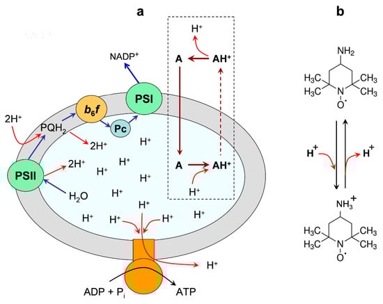 Panel (a) is an illustration of the light-induced redistribution of amine-based pH indicator Tempamine (4-amino-2,2,6,6-tetramethylpiperidine-1-oxyl, TA) between the outer space and the internal volume (lumen) of a chloroplast thylakoid. Panel (b) shows the deprotonated and protonated forms of the spin probe TA. Two different vertical arrows (continuous and dashed lines) symbolize the high and low permeability of the neutral and charged forms of TA through the membrane. Modified Figure 3 from [], with permission.