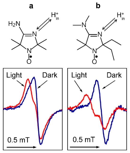 The high-field components of the EPR spectra of pH-sensitive nitroxide radicals 4-amino-2,2,5,5-tetramethyl-2,5-dihydro-1H-imidazol-1-oxyl (a) and 4-dimethylamino-2,2-diethyl-5,5-dimethyl-2,5-dihydro-1H-imidazol-1-oxyl (b) localized inside bean thylakoids. In both cases, illumination of chloroplasts by white light leads to the low-field shifts of the lines due to the acidification of the radical surroundings. Arrows at the top symbolize the protonation/deprotonation of the N atoms of the spin probes. Modified fragments of Figure 3 (panels b and c) from [], with permission.